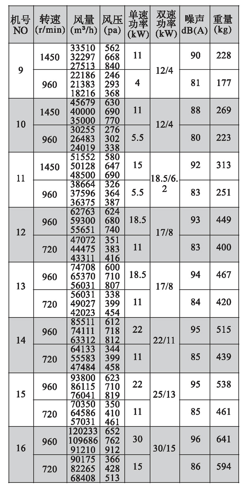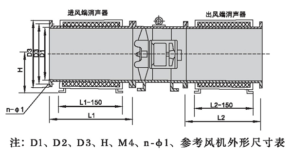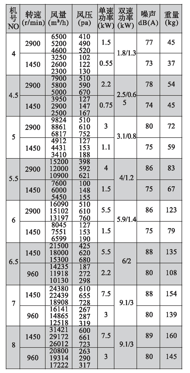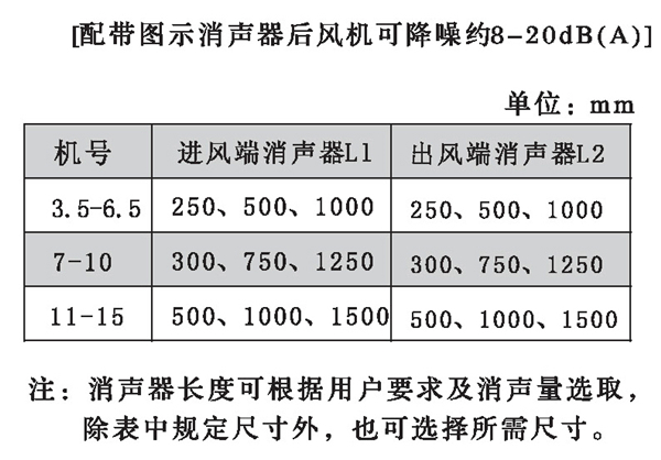 注: HTF型可根據需要制成消音型(進出風端加置專用消聲器) ;表示方法: 機號后面加字母“X”。HTF型均可制成屋頂式,表示方法:機號后面加字母“W”