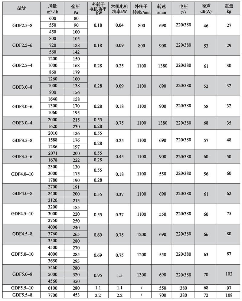 三、GDF系列離心式管道風機性能參數表