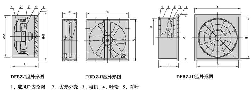 DFBZ-I型為采用內(nèi)轉(zhuǎn)子電機直聯(lián)傳動結(jié)構(gòu)形式、DFBZ-Ⅱ型采用內(nèi)轉(zhuǎn)子電機、皮帶傳動結(jié)構(gòu)形式,DFB-Ⅲ型為采用外轉(zhuǎn)子電機直聯(lián)傳動結(jié)構(gòu)形式。可根據(jù)用戶要求制威防腐防爆型。